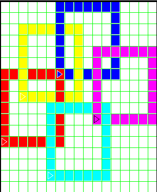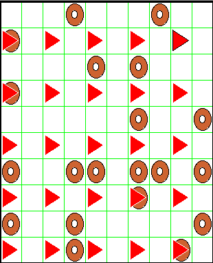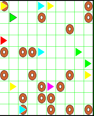 To run the program, enter the size of the grid and the number of bagels and buggles in the small window. The program then generates the grid with a random configuration of bagels and creates a list of buggles with random positions and colors (except for blue). An example of the intial configuration is shown on the left picture below.