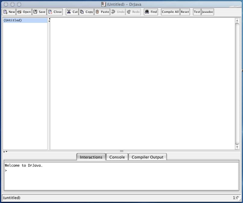 You can resize the window by pulling on down its lower right corner. The pane at the bottom of the window is called the interactions pane (it should have a message saying "Welcome to DrJava.") The pane on the left of the window is called the Documents pane. When you are editing Java files, the name of the file (or document) will appear in this pane. Finally, the pane on the right is called the Definitions pane or Editing pane. This is where contents of files will appear (i.e., the Java code in a file).