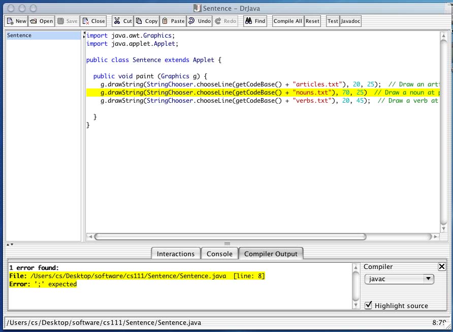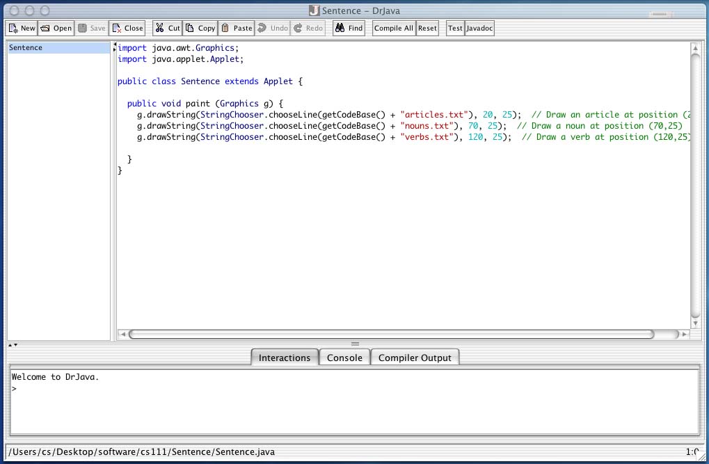 HTML file a number of times, you may guess what the program does. Let's now try changing the code of the Java applet. Return to the DrJava window which contains the code for Sentence.java. Rather than drawing the "verb" at position (120,25), what happens if we change the code to draw the verb at position (20,25)? Go ahead and change this in the Editing pane of DrJava. Now save the file and re-compile it (either by pressing the "Compile All" button or by selecting the "Tools" menu and choosing "Compile Current Document". If you compilation is successful, you can return to your internet browser and run the applet again (just click on the Refresh or Reload button. If your compilation is not successful, DrJava should indicate in yellow where an error occurred. You will probably cause a million errors throughout this course. Don't worry and don't get discouraged. Everyone does, even the most advanced programmers. That makes it all the sweeter when your programs run smoothly. Once you fix any errors, you should try recompiling the program and running the applet in your browser.