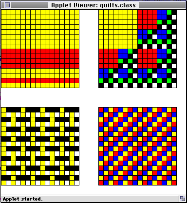 The file username_quilts.java contains a "skeleton" of the code for drawing the four quilts that you are to flesh out. This file contains a paint method for drawing the four quilts: