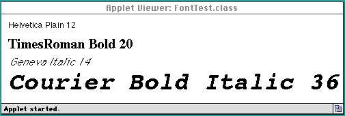 An instance of Java's Font class represents a particular font. Each font has a family name (Helvetica, TimesRoman, Courier, etc.), a style (bold, italic, etc.), and a size (8, 10, 12, etc.). To see how these attributes affect the font, make selections in the following three lists, and then select the Preview button: