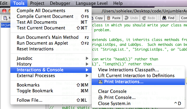 java Unjumbler. This should display test cases illustrating that all your methods from this assignment work correctly. To create a transcript in DrJava, run your program, which should display test cases for all of your methods in the interaction pane. You can then print the contents of DrJava's interaction pane by selecting Tools > Interactions & Console > Print Interactions (see image below). Attach this transcript to your hardcopy.