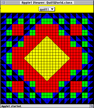 The next morning you rush off to work to encode your design as a PictureWorld picture-generating methods named quilt2().