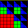 Flesh out the skeleton of the quilt2() method in the file QuiltWorld.java so that it returns a picture for the quilt shown above. Strive to make your code as clear and understandable as possible. You should study the quilt carefully to find repeated visual patterns that you can capture by writing auxiliary methods that you invoke from quilt2() or other auxiliary methods. It is a particularly good idea for some of your auxiliary methods to be parameterized over colors. For example, the four quadrants of the above quilt are rotated versions of the same visual pattern; the only difference between these patterns is their color scheme. This structure should be apparent in your code.