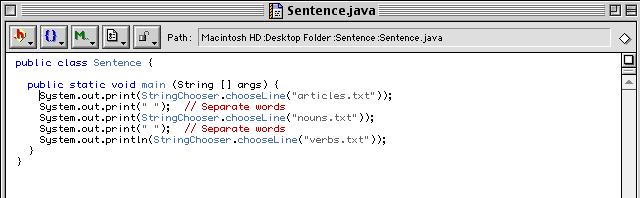 If you want to change a file, say Sentence.java, double-click on it. The text editor called SImple Text will open the file.
