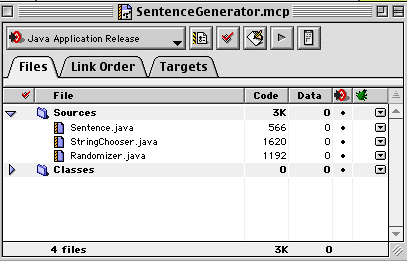Note that the window has 3 tabs: Files, which shows you the files included in the project, Link Order, which allows you to specify the order of compilation of your files, and Targets. In this lab you will only be using Files.