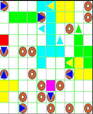 To run the program, the user enters the size of the grid, the number of bagels and buggles, and the number of rounds in the small window. The program then generates the grid with a random configuration of bagels and creates an array of buggles with random positions and colors (except for blue). An example of the initial configuration is shown on the left picture below.